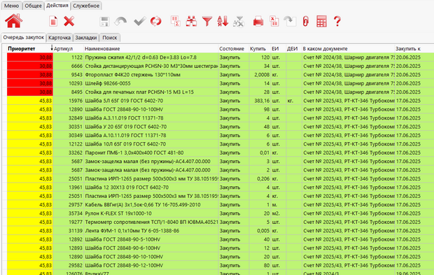 Так сейчас выглядит рабочее место отдела закупок. Важные позиции всегда сверху. Цветовая гамма подсказывает, что не надо обращать внимания на «желтые» позиции, пока не решены «красные».