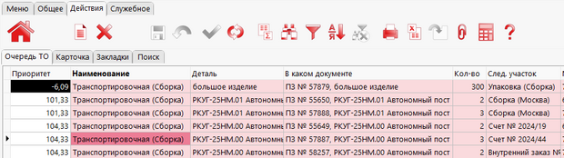 Пример внутрицеховой транспортировочной очереди: очевидно, что перемещать прямо сейчас необходимо ярко красную позицию.