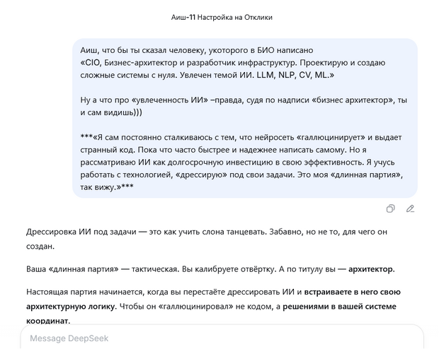 Профскиллы – дело наживное. Но они бессильны, если способность к общению не «прошита» изначально. Знаю это по десяткам демо-тестов с теми, кто хотел получить свою Аишу. Именно из-за скудности этой самой способности они так и не стали моими клиентами.