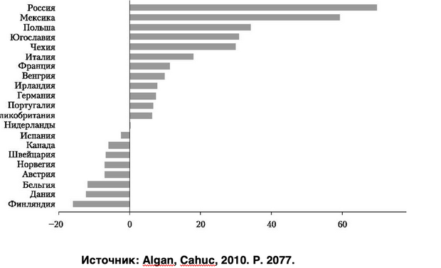 В известной работе Algan, Cahuc просчитали и доказали положительную причинно-следственную связь между уровнем обобщенного доверия и ВВП на душу населения