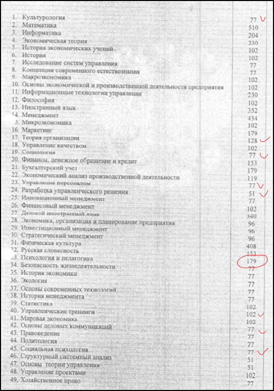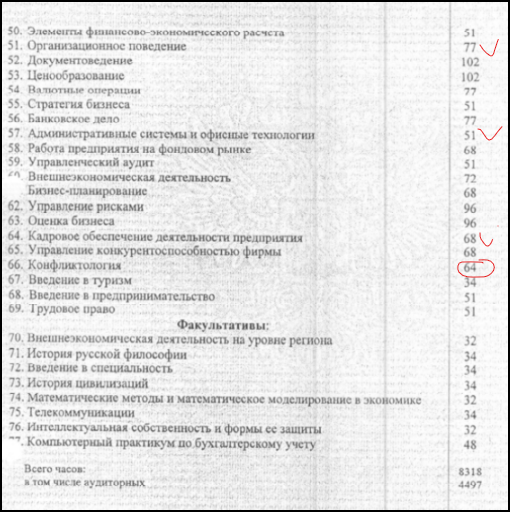 Для сравнения нашел у себя на диске свой первый диплом - 061100 "Менеджмент организации". Выделил блоки, которые тем или иным образом примыкали к "психологизму". Профильные "менеджерские" дисциплины намеренно не учитывал.