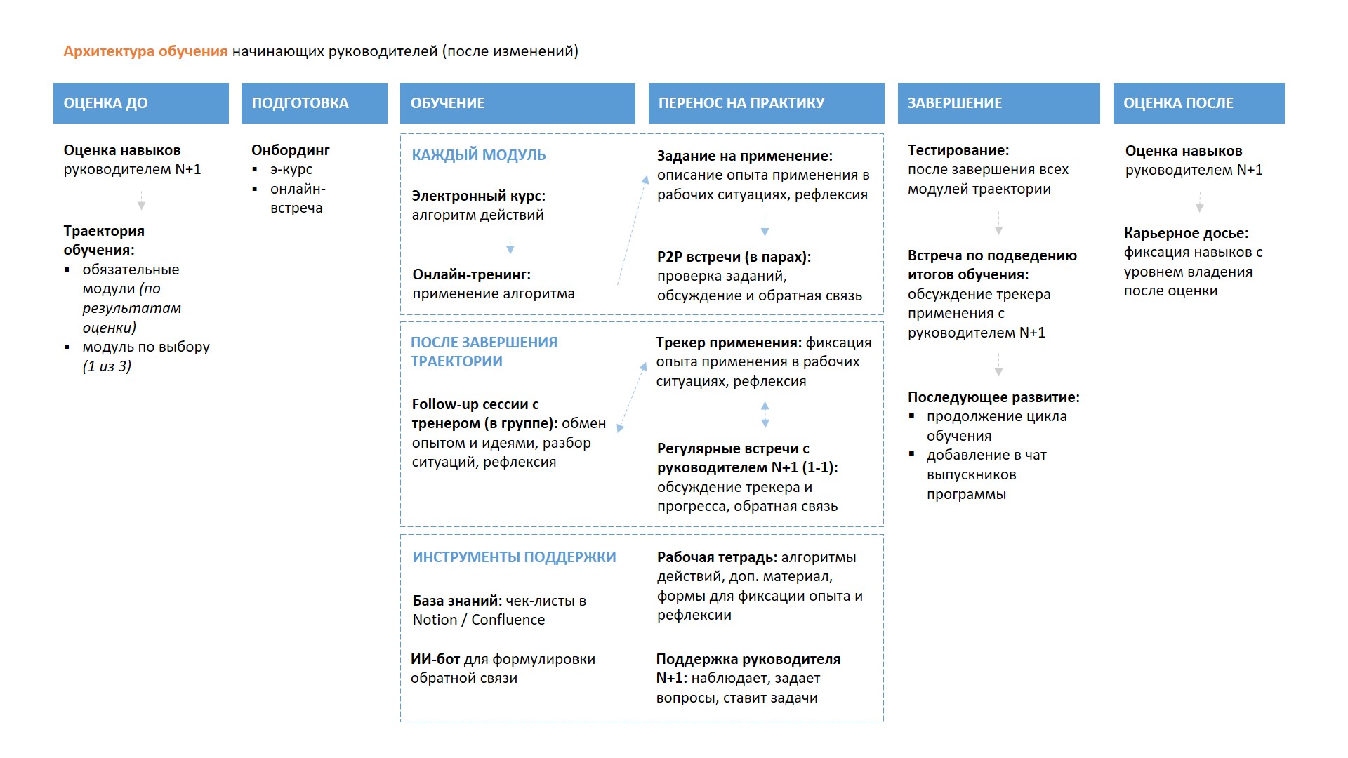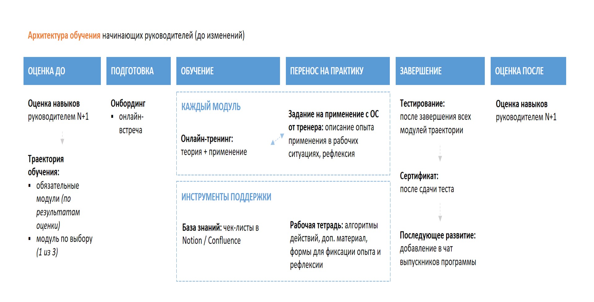 По результатам исследования прояснился профиль навыков руководителя первого уровня. Чтобы сформировать эти навыки у сотрудников, разработали следующую архитектуру обучения: