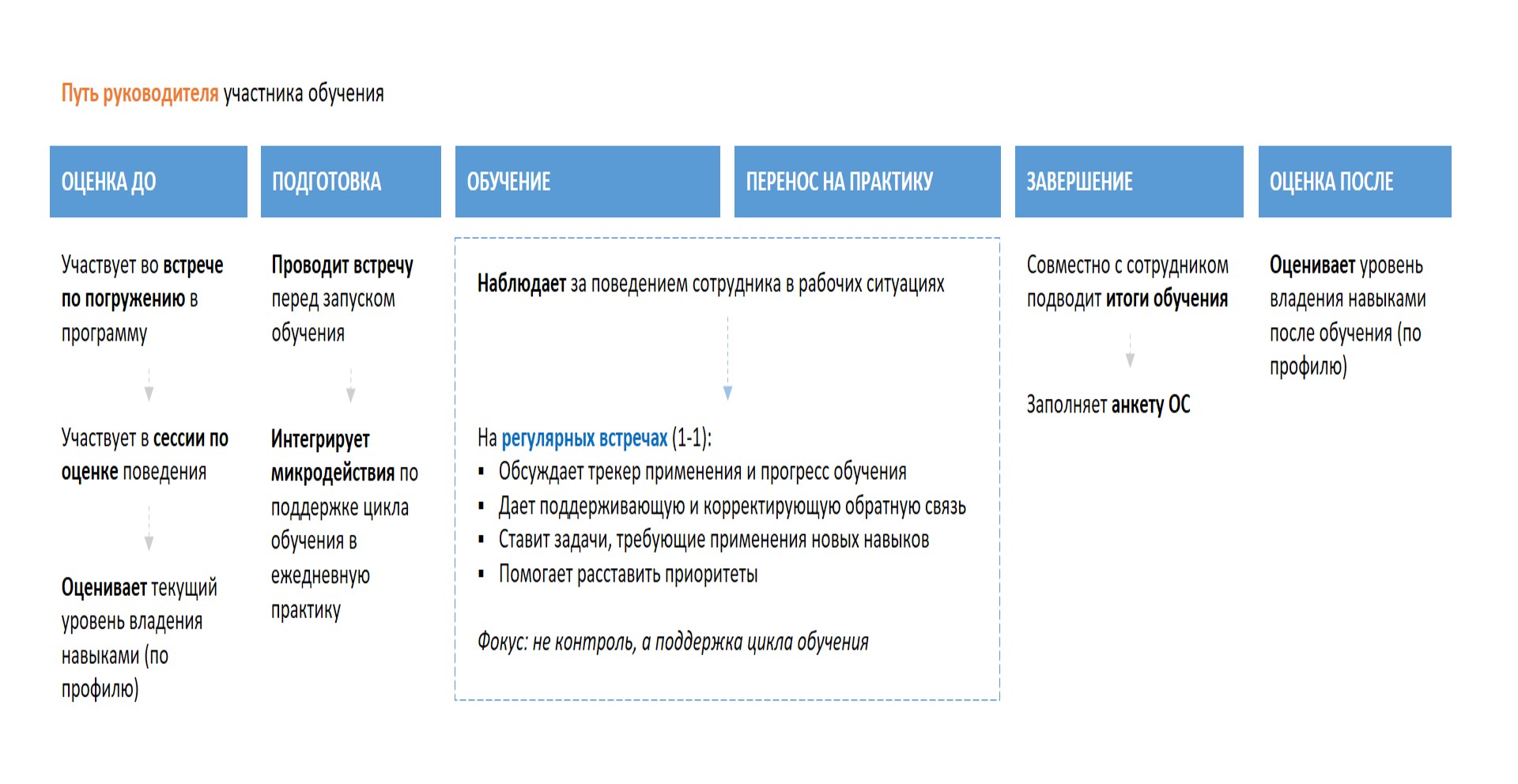 3. Подробно описали роль и задачи непосредственных руководителей участников обучения для поддержания переноса обучения, определили ключевые «точки входа».