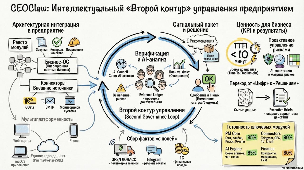 В марте выпустили первую версию системы AI-PMO под названием CEOClaw (v1.0.0). Это работающее приложение с дашбордом проектов, Kanban-досками и встроенными AI-агентами, протестированное на строительных проектах компании «Северавтодор» — дороги и производство щебеночной продукции. Таким образом, путь от дипломной работы MBA до работающего продукта занял менее полугода.