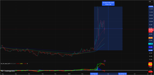 Вспомним историю: в 1980 году цена достигла исторического максимума, а потом падала десятилетиями. В 2011-2015 годах после сильного ралли последовала коррекция на 40-45%. Сегодня фундамент выглядит прочнее: спрос от официального сектора шире, денежная масса М2 глобально приближается к $100 трлн и продолжает расти (в январе 2026 года трехмесячный прирост составил около 4% в долларовом выражении), добыча ограничена.