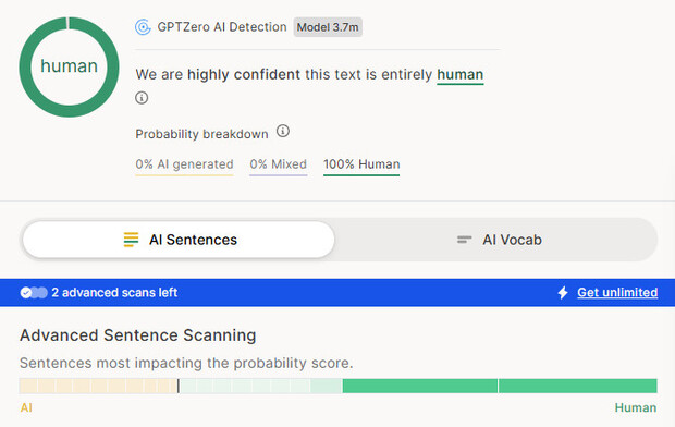 Так что ИИ счел эту статью преимущественно написанной человеком.