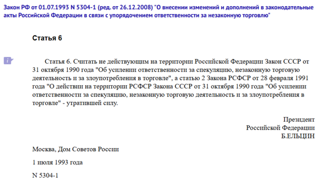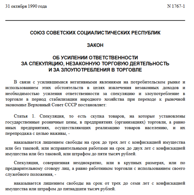 Спекуляция перестала быть таковой после того, как был принят Указ Президента Российской Федерации от 29.01.1992 г. № 65 "О свободе торговли".