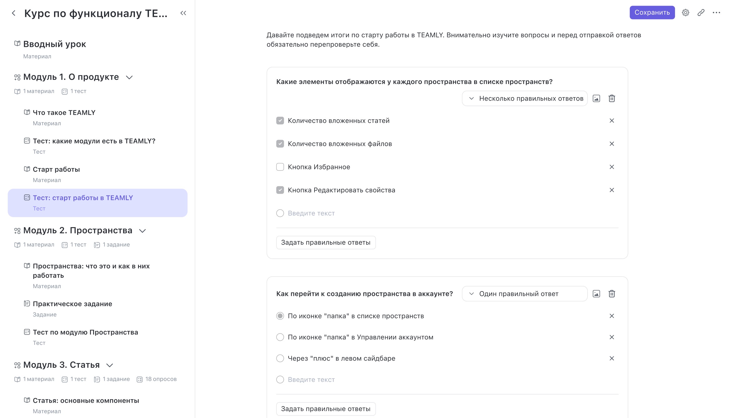 Теперь TEAMLY AI автоматически формирует тесты на основе материалов курса. Для оценки усвоения материала умный помощник формирует вопросы, выбирает оптимальные форматы (вопросы с несколькими вариантами ответов, открытые вопросы) и настраивает сложность тестов. Это позволяет поставить интеллектуальную проверку знаний на поток с высокой степенью адаптивности под конкретные задачи компании.