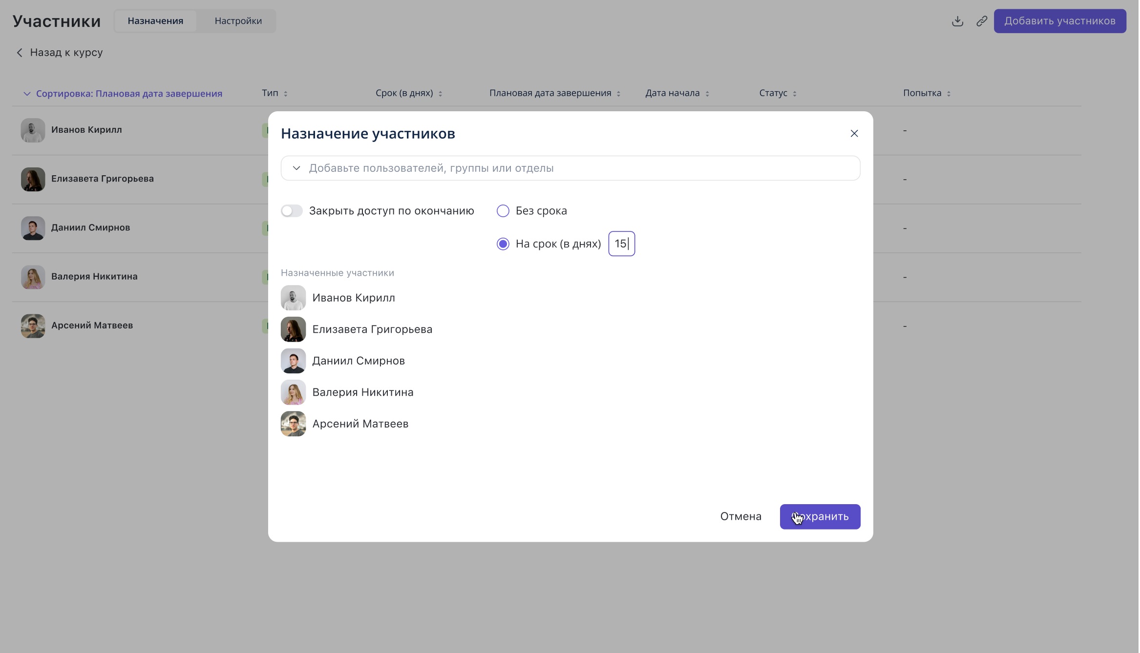 Контролировать сроки обучения стало проще: пользователь задает дедлайны для курсов, а система автоматически закрывает доступ после их окончания. Благодаря этому обучение становится управляемым и прозрачным, а HR избавляется от необходимости вручную следить за соблюдением графика.