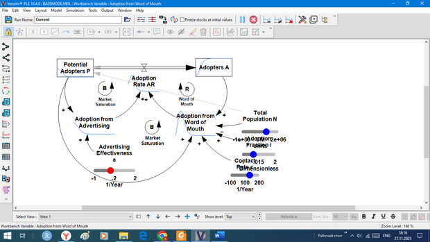Это - знаменитая модель Басса - распространения продукта. При желании, рекламу можно разложить на виды, учесть эффективность этих видов в зависимости от финансирования; нелинейные, а иногда и табличные функции). Даже на этой картинке видны слайдеры настройки, можно и оптимизировать структуры финансирования рекламного продвижения. Но, маркетологи не любят таких подходов, т.к. просматривается "результативность их титанических, креативных трудов", кроме того, понятно как измерять результаты их работы.