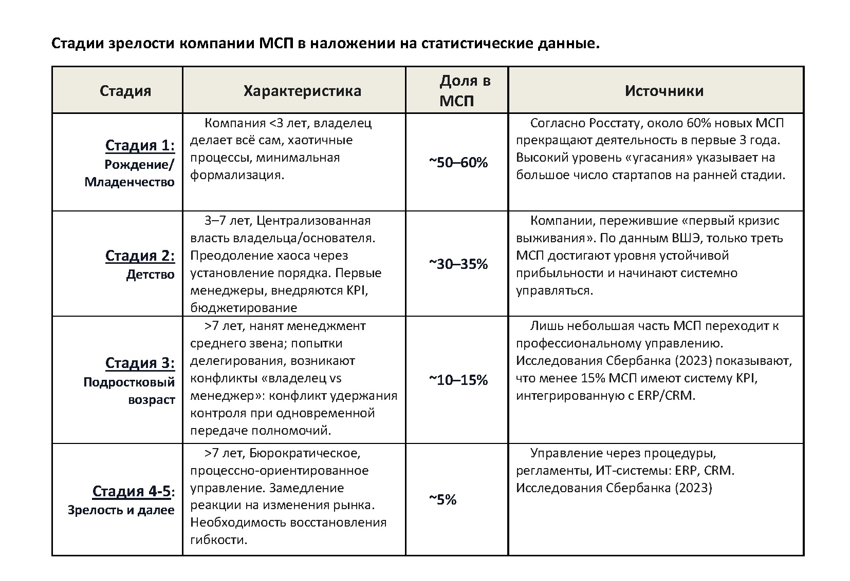 Те, кто выживает, проходят типовые этапы развития. Можно сравнить жизненный цикл компании с этапами взросления человека: от рождения до зрелости. Вот как выглядит структура бизнес-процессов МСБ на разных стадиях зрелости организации в разрезе статистических данных.