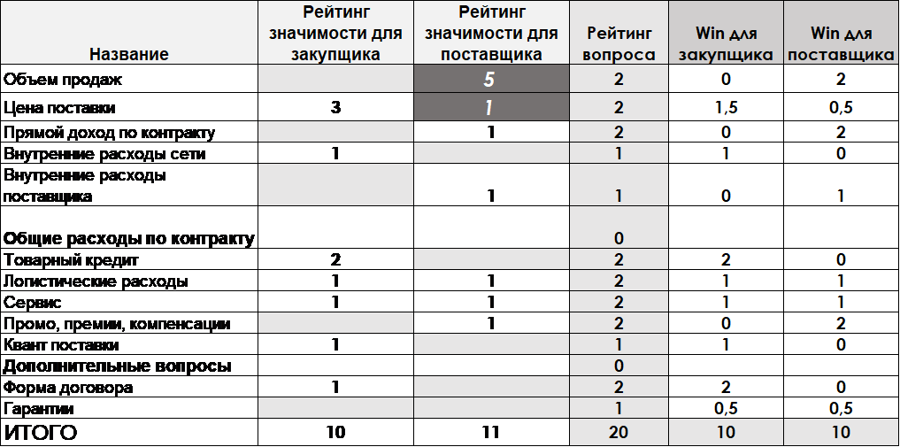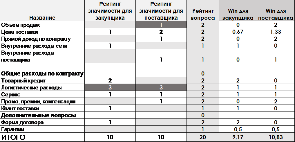 В результате поставщик занизил значимость для себя объемов продаж, а для закупщика повысил важность логистики, снизив значимость цены.